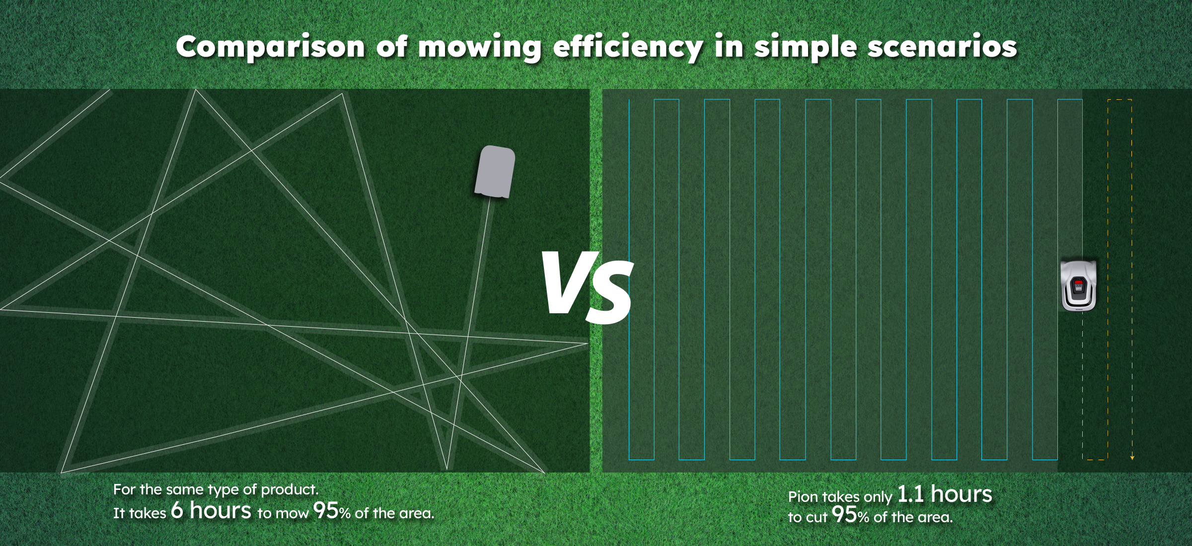 Pion's mowing speed is 90㎡/h, while similar fence products only have a mowing speed of 30㎡/h. In complex lawn environments, Pion's mowing efficiency will be higher, allowing your lawn to be perfectly trimmed in the shortest time.